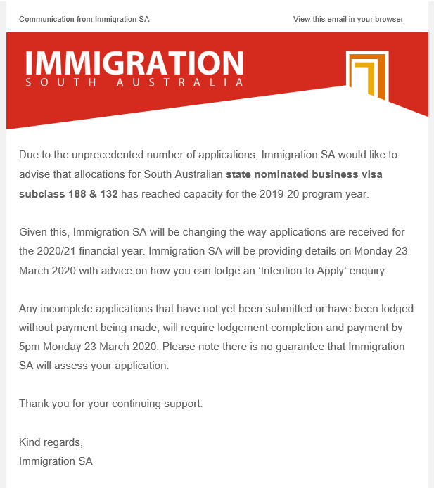 繼昆州、新州、首都領(lǐng)地的投資移民名額耗盡之后,南澳政府宣布本財(cái)年188類和132類投資移民配額也已經(jīng)用完了,現(xiàn)已關(guān)閉申請(qǐng),2020年7月1日重開。