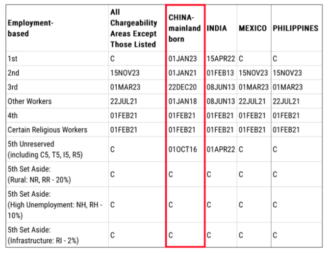 EB-5預(yù)留簽證類別:C代表無排期;