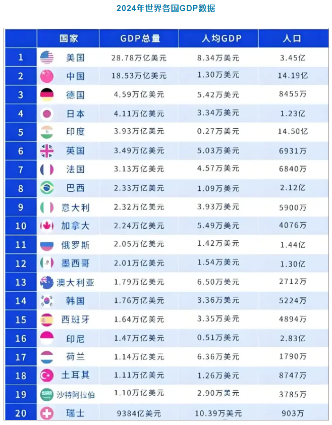 2024年的大排名,美國(guó)還是老大,GDP總值來(lái)到了28.78萬(wàn)億美元。