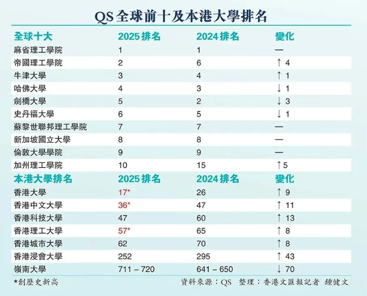 圖源:2025年QS全球前十及香港大學(xué)排名