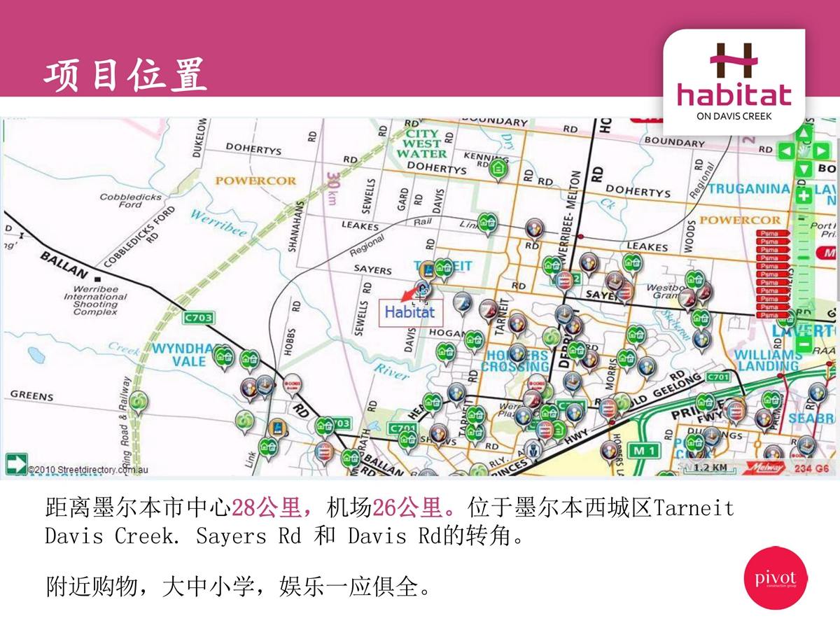 距離墨爾本市中心28公里,機(jī)場26公里。位于墨爾本西城區(qū)Tarneit Davis Creek. Sayers Rd 和 Davis Rd的轉(zhuǎn)角。