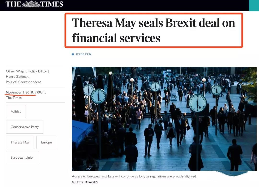 據(jù)英國(guó)泰晤士報(bào)(2018年11月1日)最新報(bào)道,英國(guó)首相特雷莎·梅已經(jīng)與歐盟達(dá)成協(xié)議,歐盟將允許英國(guó)金融機(jī)構(gòu)在脫歐后繼續(xù)擁有歐洲市場(chǎng)準(zhǔn)入。