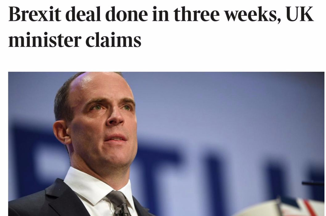 脫歐大臣拉布表示,英國(guó)和歐盟目前已經(jīng)解決了大部分問(wèn)題,脫歐談判取得了實(shí)質(zhì)性進(jìn)展,歐盟和英國(guó)都愿意加快談判速度,在三周內(nèi)達(dá)成脫歐協(xié)議。