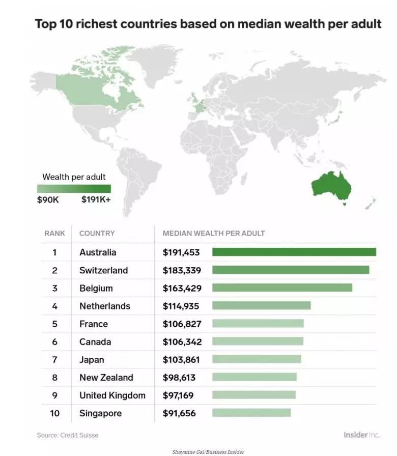 眾所周知美國(guó)是全世界百萬富翁最多的國(guó)家。但少數(shù)人的財(cái)富不代表國(guó)家范圍內(nèi)居民的平均實(shí)力。上升到人民的層面,按成人財(cái)富中位數(shù)來看,澳大利亞,是世界最富有的國(guó)家。
