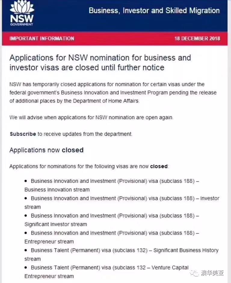 暫停所有商業(yè)移民申請;包括188A創(chuàng)業(yè)投資類,188B投資類,188C重大投資者類,和132天才企業(yè)家類移民簽證州擔(dān)保申請,政府會進(jìn)一步通知何時(shí)將再次開放申請。