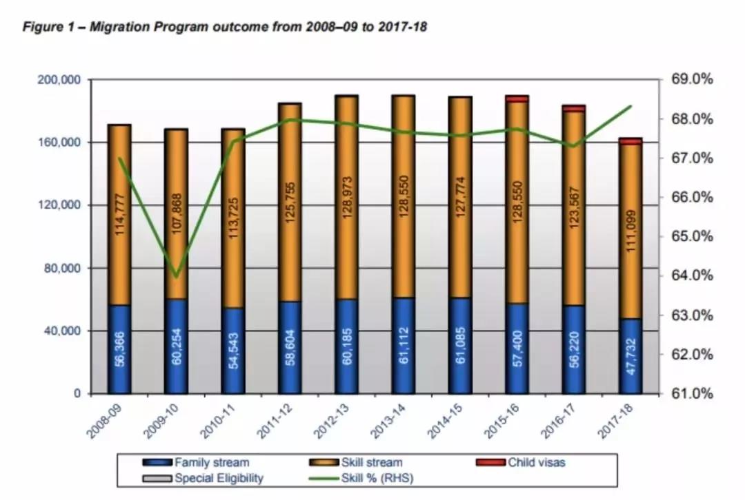 ▲澳洲移民局2008~2009年至2017~2018年移民結(jié)果