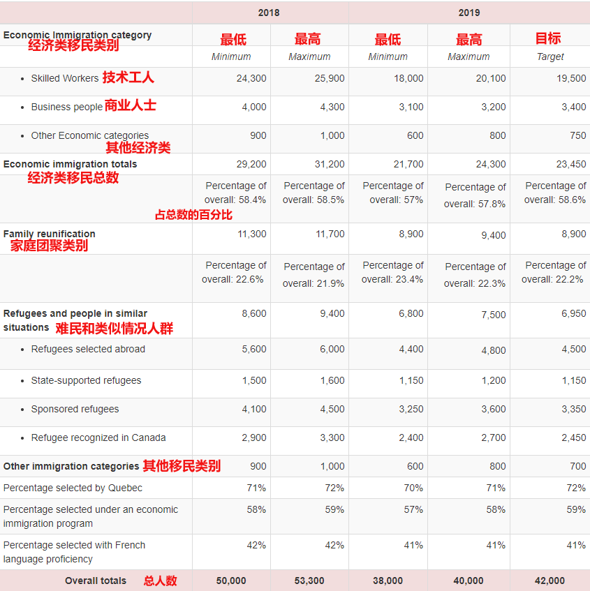 根據(jù)魁北克省公布的2019年移民計(jì)劃,全年的移民配額為4.2萬,其中經(jīng)濟(jì)類移民23,450,家庭類8,900,難民類6,950,其他類別700。