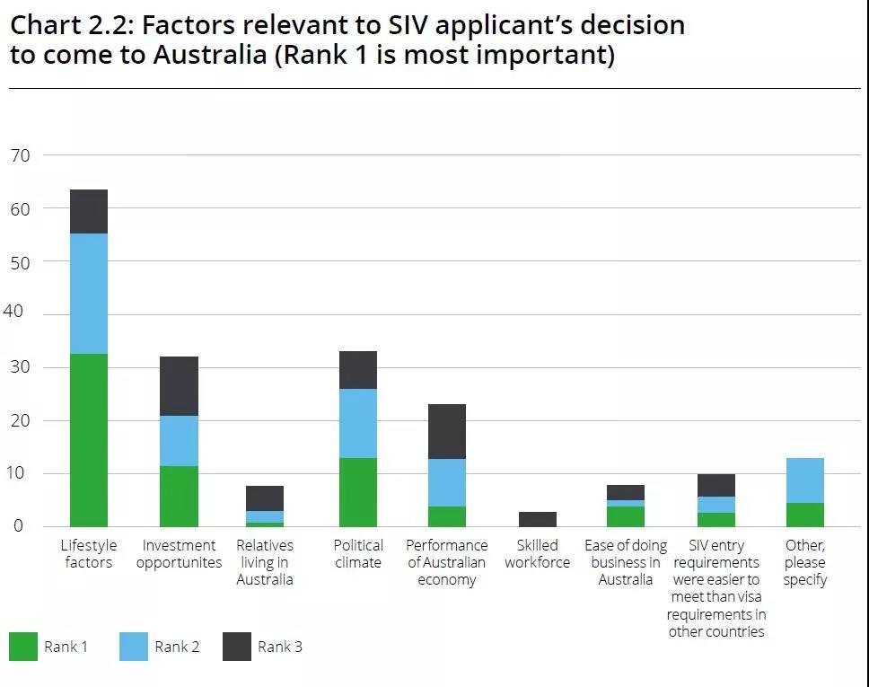 調(diào)查發(fā)現(xiàn),澳大利亞的生活方式、政治環(huán)境和投資機會是SIV投資者選擇澳洲的三個最主要原因。當然,鑒于教育是澳大利亞最大的出口服務(wù)業(yè),孩子的教育也被認為是一個重要原因。