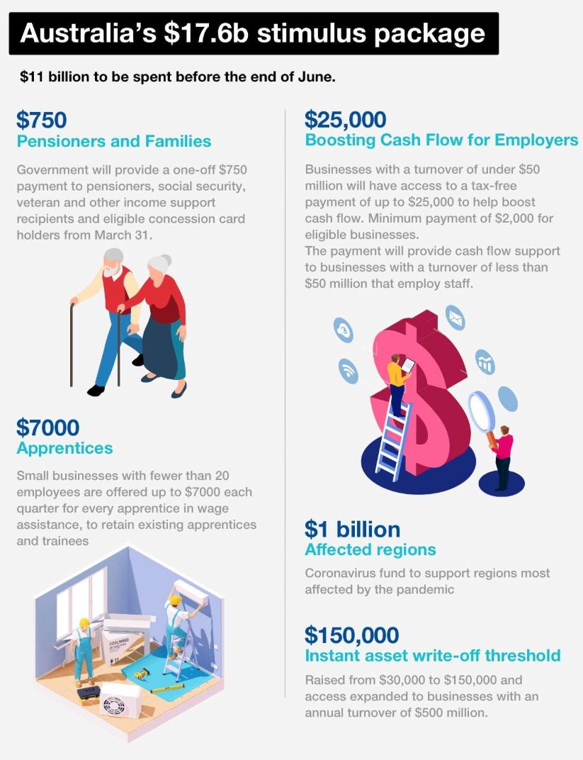 1. 部分福利領(lǐng)取者獲750元補(bǔ)助 這一項(xiàng)是和在澳華人最息息相關(guān)的了! 650萬(wàn)澳洲人將從3月31日起,獲得即時(shí)性的750澳元現(xiàn)款補(bǔ)助。 養(yǎng)老金領(lǐng)取者,以及新起點(diǎn)(Newstart)尋工津貼、殘障補(bǔ)助金、照顧者津貼、青年津貼、退伍軍人補(bǔ)助和家庭稅務(wù)福利的受領(lǐng)人,都將獲得這筆錢款。健康保健卡(Health care card)持有者也將獲得這筆現(xiàn)款補(bǔ)助。 莫里森強(qiáng)調(diào),他希望這筆一次性款項(xiàng)能提高消費(fèi)者的信心,人們收到這筆款項(xiàng)后不要將其存入銀行而是拿去花掉。 2. 雇傭?qū)W徒的企業(yè)獲工資補(bǔ)貼 政府宣布向各家小企業(yè)發(fā)放最高2.1萬(wàn)澳元薪資補(bǔ)助,以便確保它們有能力留住近12萬(wàn)名學(xué)徒和培訓(xùn)生。 從今年1月1日(追溯政策)至9月30日,雇主將獲得相當(dāng)于學(xué)徒或?qū)嵙?xí)生工資50%的工資補(bǔ)貼。 對(duì)于雇員少于20人的小型企業(yè),每名學(xué)徒工每季度將獲得$7000的工資補(bǔ)貼。 那些有一技之長(zhǎng)、正在企業(yè)做學(xué)徒工和培訓(xùn)生的朋友們賺到了! 3.小企業(yè)最高免稅2.5萬(wàn)元 如果哪位華人朋友在澳洲創(chuàng)業(yè)、經(jīng)營(yíng)了小企業(yè),最近受到山火和疫情影響,收入和利潤(rùn)都不甚理想,現(xiàn)金流也危??杉?,這下該能夠稍微喘口氣了。 此次一攬子計(jì)劃中,營(yíng)業(yè)額少于5000萬(wàn)澳元的企業(yè)可獲得最高2.5萬(wàn)澳元的免稅額,用于增加其現(xiàn)金流。 據(jù)估,此舉將在4年內(nèi)耗資67億澳元,令近70萬(wàn)家企業(yè)和780萬(wàn)勞動(dòng)者受惠。 4.設(shè)立10億旅游專項(xiàng)基金 澳洲財(cái)長(zhǎng)Josh Frydenberg 宣布了一項(xiàng)10億澳元的基金,用于在新冠病毒大流行疫病期間支持澳洲的旅游業(yè)。 新冠病毒疫情期間對(duì)來(lái)自中國(guó),伊朗,韓國(guó)和意大利的外國(guó)公民的旅行禁令,以及夏季山林大火危機(jī),都使國(guó)內(nèi)旅游業(yè)受挫。 “這將包括為在聯(lián)邦國(guó)家公園和大堡礁海洋公園經(jīng)營(yíng)的旅游企業(yè)免除某些費(fèi)用,”財(cái)長(zhǎng)說(shuō)。 澳洲政府計(jì)劃增加國(guó)內(nèi)旅游推廣,并通過(guò)澳大利亞貿(mào)易委員會(huì)提供額外援助,以解決供應(yīng)鏈破壞的問(wèn)題。 而且這筆錢也會(huì)用于山火地區(qū)的修復(fù)?!熬拖裨谏搅执蠡鹬邪l(fā)生的那樣,澳州稅務(wù)局(ATO)還將為那些受到嚴(yán)重影響的人提供救濟(jì),將各項(xiàng)納稅義務(wù)延期長(zhǎng)達(dá)四個(gè)月?!?/span>