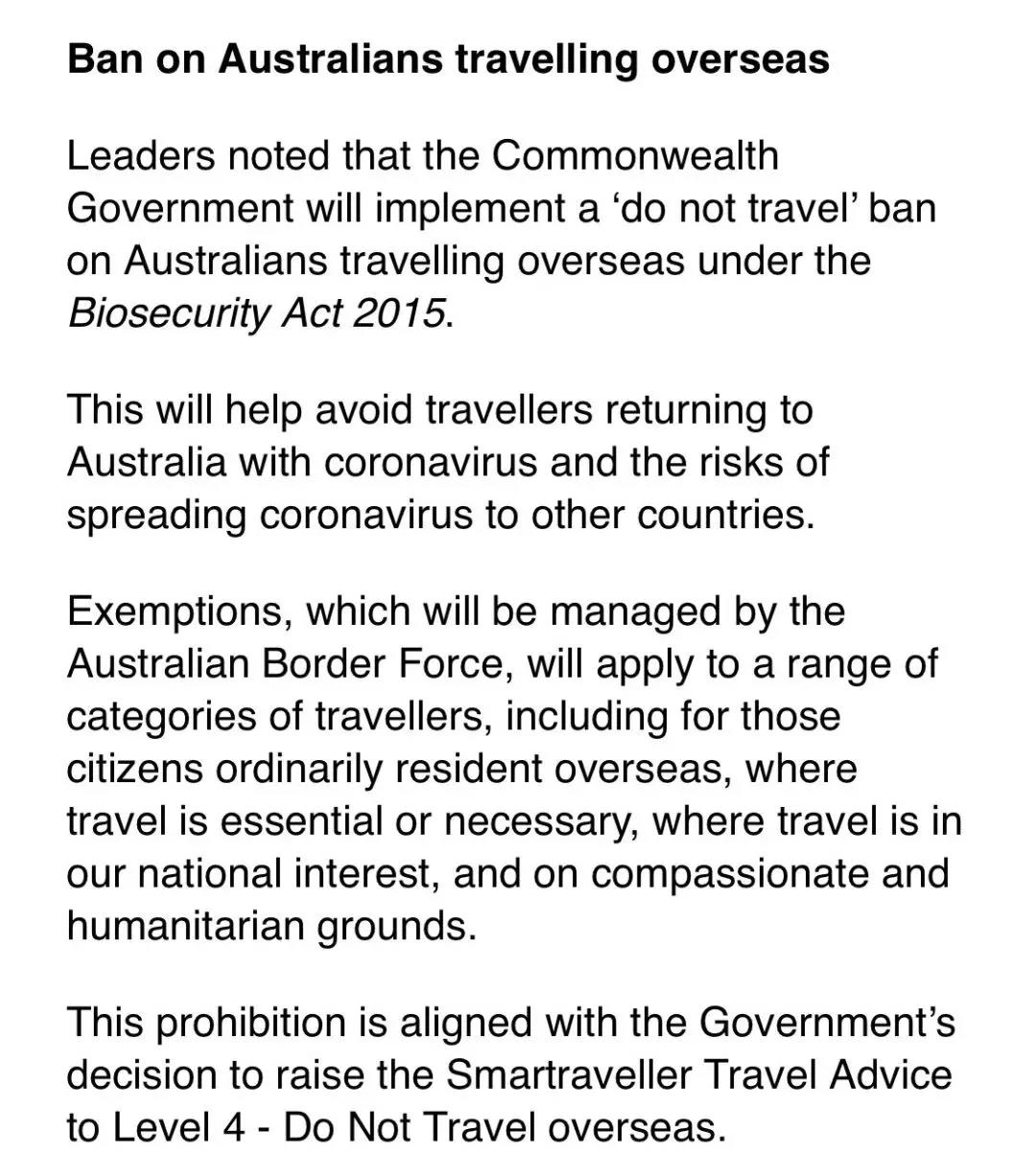 注意:該禁令是主要針對澳洲公民和PR,PR被禁是因為這個簽證代表你是長久居住在澳洲的人;PR非要離開的話,要出示證明,闡述你必須離開的理由。