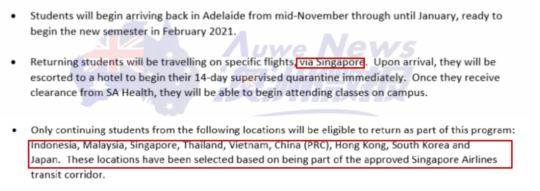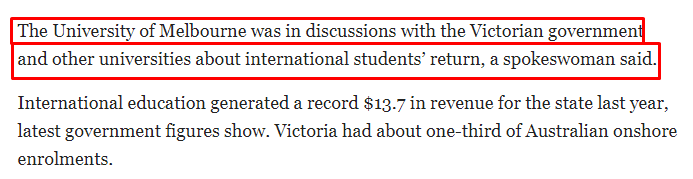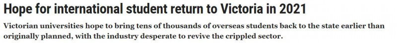 過(guò)去24個(gè)小時(shí)內(nèi),全澳一共新增14例,其中: 維州新增7例,無(wú)死亡病例; 新州新增7例,均為境外返澳人士,連續(xù)三天無(wú)本地新增確診病患; 昆州0新增; 截止發(fā)稿前,其他州/領(lǐng)地暫無(wú)數(shù)據(jù)。 今天的新增使得大墨爾本地區(qū)的14天平均新增下降至4.6,低于規(guī)定的平均5例的水平,而偏遠(yuǎn)地區(qū)的這一數(shù)字則降至0.2。 新增的7例確診中,有6例與墨爾本北區(qū)的爆發(fā)有關(guān)。 目前北區(qū)的感染集群總確診人數(shù)已經(jīng)達(dá)到39例,并且病毒已經(jīng)蔓延到了位于Macleod的Regis養(yǎng)老院,該養(yǎng)老院有兩名工作人員確診。 維州州長(zhǎng)Daniel Andrews表示,由于來(lái)自北區(qū)的1000個(gè)新冠檢測(cè)仍在化驗(yàn)中,因此今天不會(huì)宣布大墨爾本地區(qū)的進(jìn)一步解封措施。 (圖片來(lái)源:Herald Sun) 不過(guò)他也表示,一旦檢測(cè)結(jié)果出爐,最快在周二就可以宣布相關(guān)解封措施。 雖然今天萬(wàn)眾期待的解封沒(méi)有發(fā)生,但是維州政府剛剛宣布,正在制定留學(xué)生返澳試點(diǎn)計(jì)劃! 返回墨爾本、繼續(xù)學(xué)業(yè)的這一天終于要來(lái)了! (圖片來(lái)源:Herald Sun) 根據(jù)Herald Sun的報(bào)道,維州政府正在制定接回留學(xué)生的計(jì)劃,這項(xiàng)計(jì)劃將基于南澳的試點(diǎn)計(jì)劃來(lái)進(jìn)行。 據(jù)悉,南澳的試點(diǎn)計(jì)劃針對(duì)的留學(xué)生,涵蓋了印度尼西亞、馬來(lái)西亞、新加坡、泰國(guó)、越南、中國(guó)大陸、中國(guó)香港、韓國(guó)以及日本。 這批發(fā)返澳留學(xué)生的人數(shù)為300,返澳時(shí)間確定大約在11月中旬到1月,以確保學(xué)生能夠順利趕上在2021年2月開(kāi)始的新學(xué)期的學(xué)習(xí)。 和北領(lǐng)地的試點(diǎn)計(jì)劃一樣,返澳南澳的學(xué)生將從新加坡轉(zhuǎn)機(jī),在抵達(dá)澳洲后也需要前往指定的地點(diǎn)進(jìn)行為期14天的隔離。 學(xué)校以及政府將負(fù)責(zé)對(duì)學(xué)生的接送和隔離酒店的安排。 對(duì)于此次的返澳行程,留學(xué)生需要自行支付2500澳元,包括機(jī)票、接送已經(jīng)隔離的費(fèi)用,而其余的部分則由校方承擔(dān)。 目前,維州政府打算于明年2月底開(kāi)始這一計(jì)劃,相關(guān)部門(mén)的工作人員也將會(huì)密切關(guān)注南澳的項(xiàng)目進(jìn)行情況。 維州政府發(fā)言人表示:“州政府正繼續(xù)與聯(lián)邦合作制定詳細(xì)的提案,我們期待留學(xué)生的回歸?!?/p> (圖片來(lái)源:Herald Sun) 國(guó)際教育業(yè)是維州最大的產(chǎn)業(yè),封鎖限制實(shí)施以來(lái),僅有12萬(wàn)名國(guó)際學(xué)生留在了維州,但是維州在校學(xué)習(xí)的留學(xué)生為23萬(wàn)。 也就是說(shuō)有一大半的留學(xué)生目前還是滯留海外,無(wú)法返澳求學(xué)的狀態(tài)。 澳洲國(guó)際教育協(xié)會(huì)首席執(zhí)行官Phil Honeywood表示,相比南澳和新州,第二波疫情導(dǎo)致維州失去了主要優(yōu)勢(shì)。 州政府需要盡快行動(dòng),爭(zhēng)取明年第一學(xué)期讓學(xué)生回歸。 (圖片來(lái)源:Herald Sun) 斯威本大學(xué)的發(fā)言人表示,該校正在等待限制的解除,歡迎留學(xué)生回歸。 墨爾本大學(xué)的一位發(fā)言人說(shuō),墨爾本大學(xué)正在與維州政府和其他大學(xué)討論留學(xué)生回國(guó)的問(wèn)題。