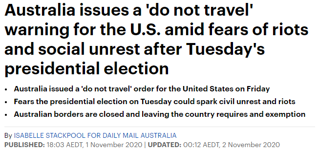 澳洲政府昨日向民眾發(fā)出警示:由于擔(dān)心即將舉行的美國(guó)大選可能引發(fā)騷亂,政府發(fā)布“不要前往”美國(guó)的旅行建議。