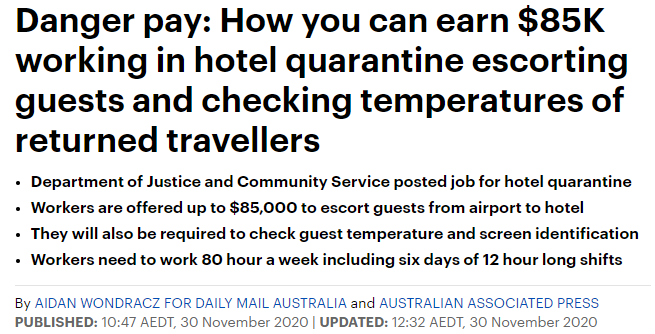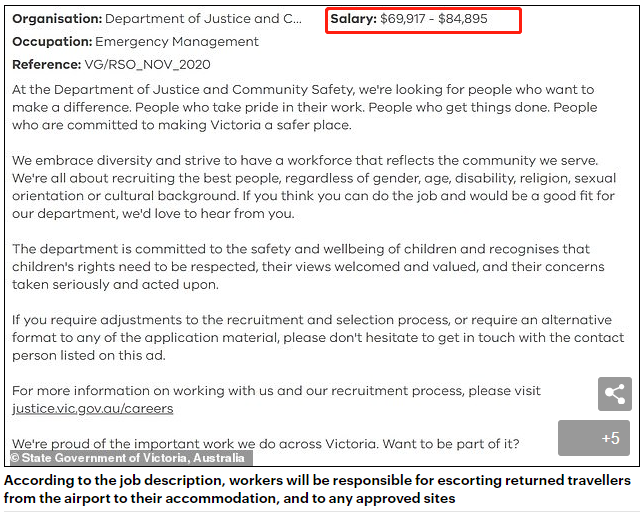 這一招聘由維州司法和社區(qū)安全部門(mén)發(fā)布,根據(jù)工作描述,工作內(nèi)容為——將旅客從機(jī)場(chǎng)護(hù)送到酒店,或其他獲批隔離地點(diǎn),此外,他們還需要在入境和出境點(diǎn)對(duì)旅客進(jìn)行體溫檢查,核實(shí)身份。