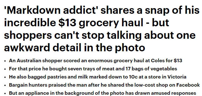 根據(jù)Daily Mail的報(bào)道,幾天前,這名澳洲男子在臉書一個(gè)名為“Markdown Addict”的群組里分享了自己的購物經(jīng)歷。