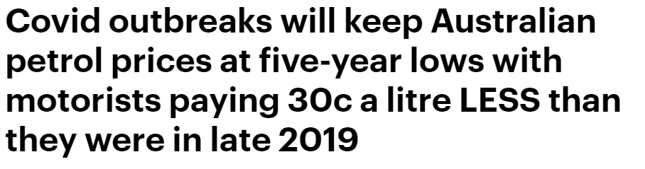 今年早些時(shí)候,一些郊區(qū)的燃油零售價(jià)格20年來首次跌至每升1澳元以下,原因是新冠疫情后各州政府頒布新冠限制,禁止民眾隨意開車旅行或是探訪親屬。