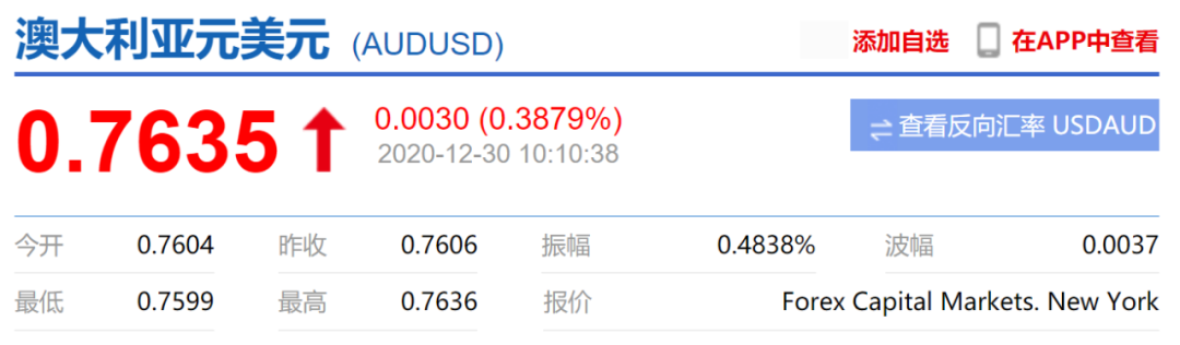 截止發(fā)稿前,澳元對美元匯率為0.7635,并且仍處于上升趨勢。