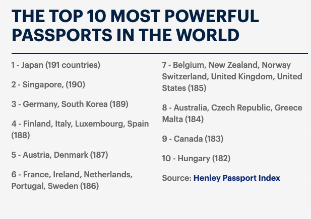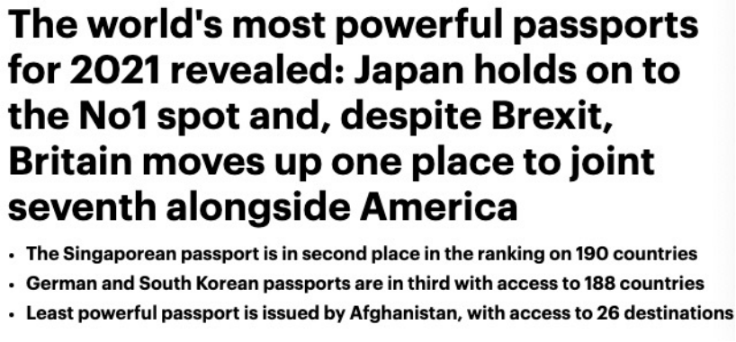2021年全球最強(qiáng)護(hù)照排名出爐 (圖片來(lái)源:每日郵報(bào)) 澳媒報(bào)道,根據(jù)2021年全球排名,日本護(hù)照連續(xù)第四年被評(píng)為全球最強(qiáng)護(hù)照!澳大利亞排名第八。 (圖片來(lái)源:網(wǎng)絡(luò)) 日本公民可免簽訪(fǎng)問(wèn)全球191個(gè)國(guó)家。新加坡護(hù)照仍在190個(gè)國(guó)家中排名第二。 (圖片來(lái)源:每日郵報(bào)) 盡管英國(guó)脫歐,但英國(guó)護(hù)照的排名從2020年初的第8位上升至第7位,共可免簽185個(gè)國(guó)家,與美國(guó)護(hù)照的排名持平。 該排名是由Henley Passport Index(亨利護(hù)照指數(shù))得出的,該指數(shù)基于國(guó)際航空運(yùn)輸協(xié)會(huì)(IATA)的獨(dú)家數(shù)據(jù)。它分析了護(hù)照持有者可以免簽或落地簽進(jìn)入的國(guó)家數(shù)量。 今年的排名未將新冠疫情大流行可能帶來(lái)的任何臨時(shí)旅行限制考慮在內(nèi)。 排在第三位的是德國(guó)護(hù)照和韓國(guó)護(hù)照,免簽國(guó)家數(shù)量為188。 在188個(gè)國(guó)家/地區(qū)中排名第四的是芬蘭和意大利的護(hù)照,以及盧森堡和西班牙(都從第五名上升)。 緊隨其后的是奧地利,它從排名第7上升到排名第5,丹麥則沒(méi)有變化,在186個(gè)國(guó)家中仍然排名第五。 排在第六位的是法國(guó)、愛(ài)爾蘭、荷蘭、葡萄牙和瑞典,他們的護(hù)照可以免簽進(jìn)入186個(gè)國(guó)家。 與英國(guó)和美國(guó)并列排名第七的是比利時(shí)、新西蘭、挪威和瑞士。 澳洲護(hù)照此次排在第8位,可免簽184個(gè)國(guó)家。 排名前十的其他國(guó)家還包括捷克共和國(guó)、希臘和馬耳他(第八)、加拿大(第九)和匈牙利(第十)。 (圖片來(lái)源:每日郵報(bào)) 亞太國(guó)家/地區(qū)護(hù)照排名飆升 亨利護(hù)照指數(shù)(Henley Passport Index)指出,亞太地區(qū)國(guó)家在2021年的排名中上升很快,這是相對(duì)較新的現(xiàn)象。 報(bào)告指出: 在該指數(shù)的16年歷史上,傳統(tǒng)上,排名前幾的國(guó)家是歐盟,英國(guó)或美國(guó)。 專(zhuān)家表示,亞太地區(qū)(Apac)的優(yōu)勢(shì)地位還將繼續(xù),因?yàn)樗艘恍┳钤鐝囊咔橹谢謴?fù)的國(guó)家。 (圖片來(lái)源:每日郵報(bào)) 過(guò)去七年來(lái),美國(guó)護(hù)照已從第一名下降到第七名,目前它與英國(guó)的地位相同。 由于與疫情有關(guān)的旅行限制,持有英國(guó)和美國(guó)護(hù)照的旅行者目前面臨著來(lái)自超過(guò)105個(gè)國(guó)家的嚴(yán)格限制,持有美國(guó)護(hù)照的人可以前往的目的地現(xiàn)在不到75個(gè),而持有英國(guó)護(hù)照的人目前可以前往的目的地不到70個(gè)。 (圖片來(lái)源:網(wǎng)絡(luò)) 報(bào)告還指出, 與2006年該指數(shù)成立時(shí)的排名相比,中國(guó)護(hù)照的排名上升得非常驚人!當(dāng)時(shí)中國(guó)的免簽或落地簽的國(guó)家僅為35個(gè),而現(xiàn)在中國(guó)護(hù)照的免簽國(guó)家有75個(gè),排在第70位! (圖片來(lái)源:每日郵報(bào)) 排名最后的仍然是阿富汗的護(hù)照,因?yàn)榘⒏缓沟墓裰荒苊夂炦M(jìn)入26個(gè)國(guó)家。 伊拉克護(hù)照排名也很差,只能自由進(jìn)入28個(gè)國(guó)家,敘利亞護(hù)照可以進(jìn)入29個(gè)國(guó)家,巴基斯坦護(hù)照可以免簽或落地簽32個(gè)國(guó)家。 編制該指數(shù)的亨利集團(tuán)合伙人Christian H. Kalin博士說(shuō),“就在一年前,所有跡象都表明,全球流動(dòng)率將繼續(xù)上升,旅行自由度將增加,擁有強(qiáng)大護(hù)照的人將比以往任何時(shí)候都享有更多的訪(fǎng)問(wèn)權(quán)。 然而,全球疫情蔓延,各個(gè)國(guó)家的不同封鎖限制讓這些預(yù)測(cè)沒(méi)有實(shí)現(xiàn),但是隨著旅行限制開(kāi)始解除,最新的護(hù)照排名也提醒人們,在疫情肆虐的世界里,護(hù)照的力量真正意味著什么。 最后 疫情以來(lái),國(guó)際旅行明顯減少,即便擁有最強(qiáng)護(hù)照,也很難實(shí)現(xiàn)說(shuō)走就走的旅行。 希望疫情盡快結(jié)束,一切恢復(fù)正常,擁有澳洲護(hù)照的小伙伴又可以自由出行184個(gè)國(guó)家!