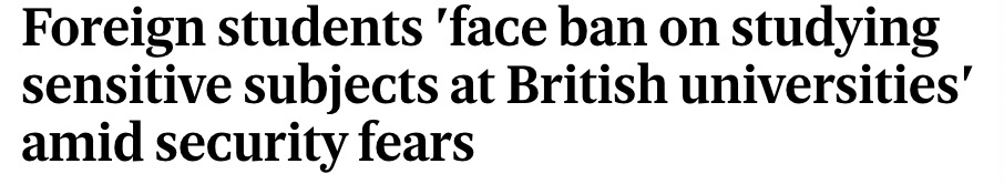 數(shù)千中國(guó)留學(xué)生或被禁止入境英國(guó) 根據(jù)媒體報(bào)道,由于擔(dān)心知識(shí)產(chǎn)權(quán)被盜,數(shù)千名中國(guó)學(xué)者和研究人員可能被禁止進(jìn)入英國(guó)。 報(bào)道稱,英國(guó)的大學(xué)被告知,外交部會(huì)對(duì)想在國(guó)家安全相關(guān)領(lǐng)域?qū)W習(xí)或工作的海外學(xué)者和研究人員進(jìn)行安全審查,如果已被視為“存在風(fēng)險(xiǎn)”的學(xué)生,其簽證將被撤銷。 (圖片來源:The Sunndy Times) 報(bào)道中指出,英國(guó)政府通信總部警告各所大學(xué)防范“敵對(duì)國(guó)家行為體”盯上英國(guó)的機(jī)構(gòu),從而“竊取個(gè)人信息、研究數(shù)據(jù)和知識(shí)產(chǎn)權(quán)”。 限制措施會(huì)影響到在44個(gè)領(lǐng)域?qū)W習(xí)或工作的學(xué)者,包括人工智能、化學(xué)、物理、數(shù)學(xué)、計(jì)算機(jī)科學(xué)和一系列工程領(lǐng)域。 相關(guān)規(guī)定還適用于在英國(guó)企業(yè)從事研發(fā)工作的專業(yè)人士。 (圖片來源:The Times) 一位女發(fā)言人在一份聲明中說: 作為一個(gè)開放國(guó)家,我們歡迎包括中國(guó)在內(nèi)的外國(guó)學(xué)生,這些外國(guó)學(xué)生增加了我們世界一流大學(xué)的學(xué)術(shù)實(shí)力。 但我們不會(huì)接受損害國(guó)家安全的合作。而學(xué)術(shù)技術(shù)批準(zhǔn)計(jì)劃(ATAS)是我們?yōu)楸Wo(hù)國(guó)家安全和抵抗外國(guó)干擾而制定的健全程序之一。 其實(shí)早在去年10月,就曾有媒體報(bào)道稱,出于對(duì)知識(shí)產(chǎn)權(quán)被盜的擔(dān)憂,英國(guó)Foreign, Commonwealth and Development Office從今日起,將擴(kuò)大其對(duì)希望學(xué)習(xí)與國(guó)家安全相關(guān)科目的海外申請(qǐng)者的安全審查權(quán)限。 (圖片來源:Standard) 國(guó)家安全委員會(huì)的部長(zhǎng)們簽署了實(shí)施更嚴(yán)格規(guī)定的計(jì)劃。 外媒稱,這一最新舉措是為了回應(yīng)政府對(duì)中國(guó)學(xué)生獲取技術(shù)和知識(shí)的日益擔(dān)憂。 據(jù)悉,2018- 2019年,在英國(guó)大學(xué)就讀的所有研究生中,中國(guó)學(xué)生占12%。 目前,申請(qǐng)敏感學(xué)科的非英國(guó)公民研究生必須獲得學(xué)術(shù)技術(shù)批準(zhǔn)計(jì)劃(Atas)下的證書。 但是來自歐洲經(jīng)濟(jì)區(qū)、美國(guó)、加拿大、澳大利亞、新西蘭、日本、韓國(guó)和新加坡的申請(qǐng)人可獲豁免。