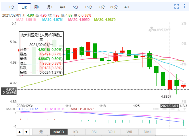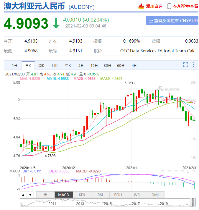 澳元匯率下跌, 已持續(xù)近半月 澳元兌人民幣匯率自1月中旬之后,就一直保持著下跌趨勢(shì)。特別是進(jìn)入到2月份以后,跌幅更加明顯。 (圖片來源:新浪財(cái)經(jīng)) 特別是2月1日,澳元匯率一度跌破了1:4.9的關(guān)口,最低的時(shí)候?yàn)?:4.8867,雖然之后有小幅度拉升,但仍然只是徘徊在1:4.91左右。 (圖片來源:新浪財(cái)經(jīng)) 按照這個(gè)趨勢(shì)1:4.9顯然不會(huì)維持太久,澳元的匯率還有進(jìn)一步下跌的可能。 澳央行加印$1000億, 成澳元匯率下跌主因 明明澳洲經(jīng)濟(jì)有所恢復(fù),失業(yè)率下降,就業(yè)人數(shù)上漲,各首府城市都開始逐漸恢復(fù)正常工作,為什么匯率反而開始走低呢? 其中原因或許有兩點(diǎn): 第一點(diǎn)澳央行宣布加印1000億澳元,以刺激澳洲經(jīng)濟(jì)能夠在疫情后期快速恢復(fù)。