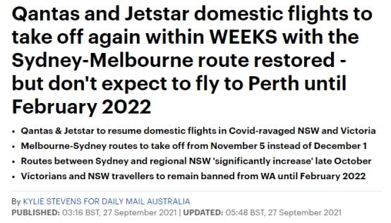 #01: Qantas國內(nèi)航線恢復 一場新冠疫情,航空也成了受影響最嚴重的企業(yè)之一,原本繁忙的機場一下子變得冷清起來。 不論曾經(jīng)多么火爆的航線,現(xiàn)在乘客都寥寥無幾。 后來,隨著澳洲的疫情復發(fā),各州邊境封鎖,航班也被叫停。 終于,隨著疫苗接種率的提高,人們看到了解封的希望,70%接種率部分解封,80%接種率國境限制都會解除一些。 (圖片來源:dailymail) Qantas和Jetstar已經(jīng)做好了航班恢復的準備,特別是墨爾本和悉尼之間的航線,兩家公司預計在11月5日起就能恢復。這比之前預計的12月1日要早很久! 而疫苗接種率最高的新州,航線恢復也是最快速的,根據(jù)預測,Qantas和Jetstar將會在短期內(nèi)恢復新州偏遠地區(qū)之間的航線,規(guī)模將很快達到疫情之前的40%。 (圖片來源:dailymail) 澳航首席執(zhí)行官Alan Joyce表示:“基于國家疫苗推廣取得的成功,部分州邊境得以重開,這真是太好了?!?/p> 他透露:qantas正計劃增加往返悉尼和墨爾本的航班,這通常是世界上第二繁忙的航線,這條航線的恢復比預期提前了近一個月。 除此之外,還有許多偏遠地區(qū)航線將自6月以來首次重啟,這不僅能提振旅游業(yè),還能讓人們與親朋好友團聚。 但是,Qantas和Jetstar的航線恢復并非覆蓋全澳,有個地方或許無法短時間內(nèi)恢復航線。 #02: 西澳航線恢復要到明年 Qantas首席執(zhí)行官Alan Joyce日前宣布:因西澳邊界預計延長關(guān)閉時間,西澳與維州和新州之間的國內(nèi)航班重啟時間將再推遲兩個月,至明年2月1日。 (圖片來源:news) Qantas還表示,國際航班將從今年12月18日開始逐步重啟,但由于最新的西澳邊界設置和假設,Qantas將暫時更改珀斯至倫敦的旗艦航班,如果恢復,至少要等到2022年的4月份。 而原本應該從墨爾本飛往達爾文在轉(zhuǎn)飛倫敦的航線,現(xiàn)在也要變?yōu)槟珷柋撅w新加坡之后轉(zhuǎn)飛倫敦。 Qantas表示,具體路線可能會在未來兩周內(nèi)做出決定。 (圖片來源:mews) Qantas的首席執(zhí)行官Joyce表示,他們與西澳政府的討論表明,在明年年初之前,他們的邊界不會向維州和新州開放。 結(jié)論就是,圣誕節(jié)之前恢復西澳與新州和維州的航線已經(jīng)變得不再可能。 不過Qantas承諾將繼續(xù)運營珀斯、悉尼和墨爾本之間的每周5班回程航班,以保持最低限度的航班數(shù)量。 最后 澳洲解封在即也讓航空業(yè)看到了恢復生機的希望,只要州邊境封鎖解除,往返于各大繁忙城市的航班就能快速恢復,可能短時間內(nèi)無法達到疫情之前的水平,但只要有充足的時間,且不受疫情影響,一切都能得到恢復。 只是西澳,因為這里是唯一在抵制澳洲聯(lián)邦政府封鎖計劃的地區(qū),航線何時能恢復也成了未知數(shù)!