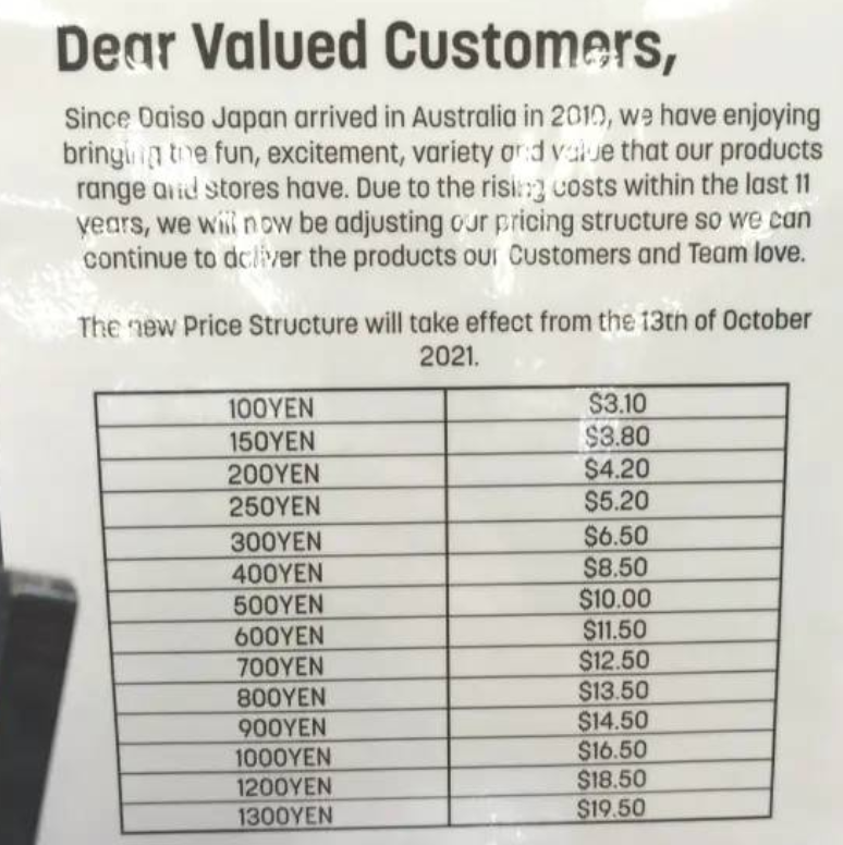 另外,澳洲的“兩元店”Daiso也宣布徹底告別最低$2.8時代,漲價到了最低$3.1。