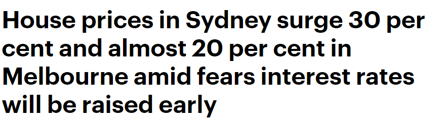 另一方面就是澳洲仍在持續(xù)飆升的房價。據(jù)媒體報道稱,隨著一個大城市的房價在一年內(nèi)飆升 30% 以上,利率可能會提前上調(diào),以阻止澳大利亞的房地產(chǎn)市場過熱。