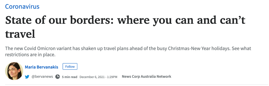 #01: 新州Omicron病例暴增, 與這幾個集群有關(guān) 就在剛剛,新州衛(wèi)生部緊急通報,Omicron確診病例突然增加了10例,現(xiàn)在Omicron的累計確診病例已經(jīng)達(dá)到了25例... (圖片來源:twitter) 截止到目前,悉尼已經(jīng)出現(xiàn)了好幾個Omicron集群感染爆發(fā),Regents Park Christian School、Regents Park的St Peter Chanel Catholic Primary School和Villawood的Sydney Indoor Climbing Gym這些都有確診出現(xiàn)。 (圖片來源:smh) 特別是St Peter Chanel Catholic Primary School,與這一集群的相關(guān)確診病例已經(jīng)增加到了14例。 除此之外,首都領(lǐng)地一例Omicron確診曾于11月27日周六光顧Sydney Indoor Climbing Gym并染疫。 病毒已經(jīng)從新州傳染到了首領(lǐng)地。 剩余的11例Omicron確診病例,均是在海外或國際航班上染疫的。截至目前,這些病例都沒有住院接受治療。 *一鍵點擊了解此商業(yè)項目詳情 #02: 澳洲邊境信息匯總 圣誕即將到來,大量澳洲人正在計劃出游,出境可能變得困難,因此境內(nèi)游變得火爆起來。 原本境內(nèi)解封以后,旅游本來沒有任何干擾,可是Omicron突然傳入境內(nèi),并且在社區(qū)傳播,各州有了邊境政策收緊的考量。 (圖片來源:herald sun) 其中南澳已經(jīng)開始收緊邊境政策了,其他地區(qū)雖然暫時沒有具體規(guī)定出臺,但并不代表隨著疫情嚴(yán)重后,限制政策仍不會出臺。 下面為大家整理一下最新的澳洲各州入境政策 南澳 原本,南澳邊境只對已接種兩劑疫苗的入境旅客開放,但是Omicron入侵以后,州長Steven Marshall宣布收緊入境限制。 雖然沒有關(guān)閉邊境但入境檢測方便,限制變得嚴(yán)格。 首先來自新州、維州和首都領(lǐng)地的旅客,在抵達(dá)南澳時必須進行新冠檢測。如果在南澳境內(nèi)停留,則需要在入境的第六天,在此進行一次核酸檢測。 針對所有國際入境旅客,必須接受14天隔離。 (圖片來源:herald sun) 昆士蘭 昆士蘭目前的規(guī)定是,來自熱點地區(qū)的跨州旅客可以入境昆州,但必須提交72小時內(nèi)的核酸檢測報告證明。 只要他們提供72小時內(nèi)PCR陰性檢測證明,并進行14天的居家隔離。 不過昆士蘭將阿德萊德列入了黑名單,從11月28日凌晨1點之后去過阿德萊德地區(qū),在12月5日凌晨1點之后抵達(dá)昆州的人,都必須接受14天的強制隔離。 從12月13日開始,昆士蘭的入境規(guī)定有所更改: 來自州際熱點地區(qū)的已完全接種疫苗的旅客可由公路或乘坐航班抵達(dá),入境后無需隔離,但必須持有抵達(dá)前72小時內(nèi)的新冠病毒陰性檢測證明。 所有入境旅客,不論是否接種接種了疫苗,都必須在到達(dá)昆州后的第5天再進行一次新冠病毒檢測。 國際旅客必須已完全接種疫苗,并在出發(fā)前72小時內(nèi)進行核酸檢測,且須接受為期14天的居家或酒店隔離。 邊境地區(qū)已完全接種疫苗的居民可持通行證自由穿越邊境,無需進行檢測。 新州、維州 新州和維州預(yù)計將在圣誕節(jié)前保持邊境開放。 并不會實施Omicron清零戰(zhàn)略。 維州州長Andrews表示,圣誕節(jié)前,邊境絕不會關(guān)閉。 (圖片來源:herald sun) 西澳 西澳政府計劃,一旦該州90%的12歲以上人口完全接種了疫苗,可能在一月底或二月初重新開放西澳。 目前,維州被評為“極端風(fēng)險”,新州被評為“高風(fēng)險”,南澳和首都領(lǐng)地為“中等風(fēng)險”。除非得到批準(zhǔn),否則來自中、高和極端風(fēng)險地區(qū)的旅客不得進入該州。 國際入境旅客必須自費在政府設(shè)施內(nèi)完成14天的強制隔離。 北領(lǐng)地 只有完全接種了新冠疫苗的人、北領(lǐng)地居民和無法接種疫苗的人群及12歲以下兒童才能進入北領(lǐng)地。 從疫情安全地區(qū)入境的未接種疫苗的北領(lǐng)地居民需要進行隔離。 從疫情熱點地區(qū)抵達(dá)的國內(nèi)外入境人員,如果接種了兩劑疫苗,可進行為期7天的居家隔離。 乘DFAT航班入境的國際旅客仍須在監(jiān)督設(shè)施內(nèi)接受14天的隔離。 未接種疫苗的北領(lǐng)地居民和獲得當(dāng)局批準(zhǔn)的紅區(qū)入境人員,在入境后必須接受14天的強制監(jiān)督隔離。 塔州 塔州的邊境入境條件取決于每位入境旅客在到達(dá)前在哪里停留。 根據(jù)該州公共衛(wèi)生建議,地區(qū)被評估為低、中或高風(fēng)險。 來自高風(fēng)險地區(qū)的入境旅客需要在政府管理的檢疫設(shè)施或合適的場所進行隔離。 首都領(lǐng)地、新州、北領(lǐng)地和維州被評為高風(fēng)險地區(qū),南澳部分場所被評為高風(fēng)險地區(qū),西澳和昆州為低風(fēng)險。 在抵達(dá)塔州前一直在上述低風(fēng)險地區(qū)停留并超過14天的入境旅客,在抵達(dá)后不需要進行隔離。 在抵達(dá)塔州前的14天內(nèi)在中風(fēng)險地區(qū)待過的旅客必須在合適的場所隔離14天。 在抵達(dá)塔州前的14天內(nèi)曾在澳洲境內(nèi)的高風(fēng)險地區(qū)待過的旅客,不允許進入塔州,除非被批準(zhǔn)為必要旅行者。 2021年11月1日至12月14日期間從海外入境澳洲的旅客(從新西蘭低風(fēng)險地區(qū)直飛澳洲的航班,或澳洲南極署批準(zhǔn)的旅客除外)將遵循與來自高風(fēng)險地區(qū)的國內(nèi)旅客相同的要求。只有接種過疫苗的塔州居民和專業(yè)工人才能獲準(zhǔn)入境。 首領(lǐng)地 首領(lǐng)地的規(guī)則和限制,分為高風(fēng)險的地理區(qū)域、