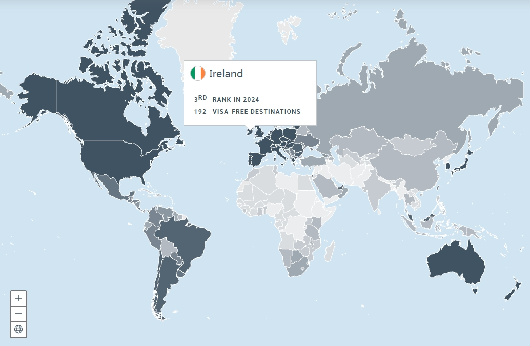 相比2023年,愛爾蘭護(hù)照免簽?zāi)康牡赜?87個(gè)增加到了192個(gè),排名上升了3個(gè)名次。