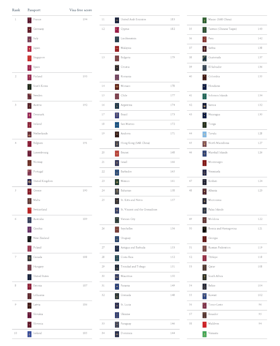法國(guó)、德國(guó)、意大利、日本、新加坡和西班牙史無(wú)前例地并列第一,免簽/落地簽全球194個(gè)目的地。