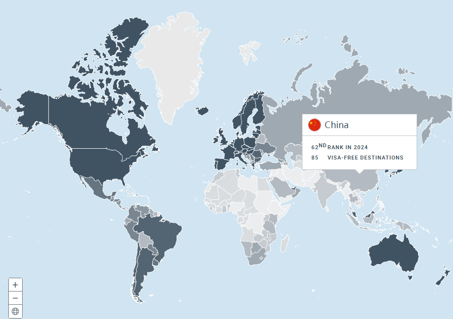 中國(guó)免簽?zāi)康牡剡_(dá)到85個(gè),排名世界第62位。