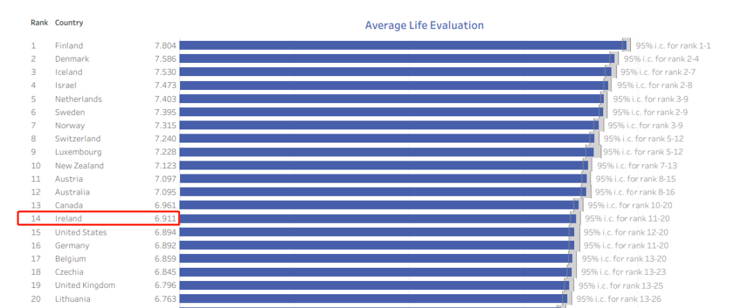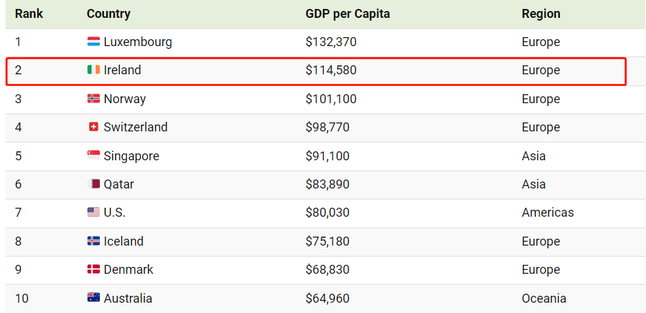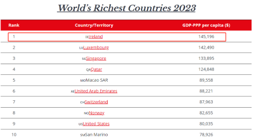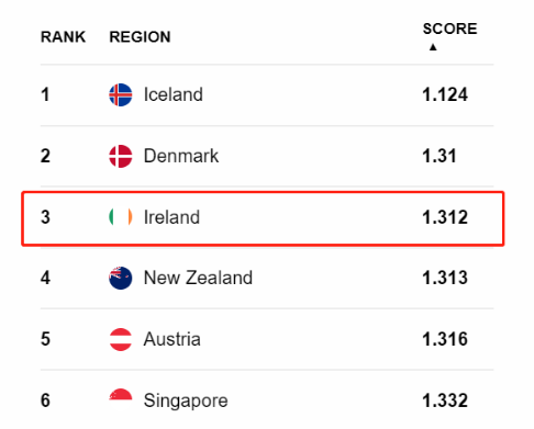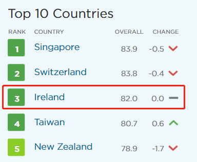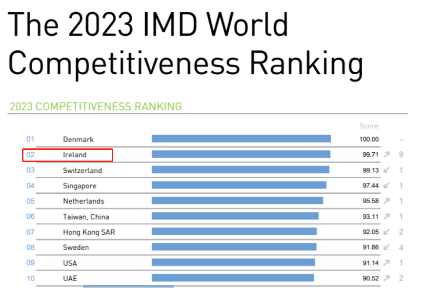 漫步在愛爾蘭的街頭巷尾,你可以感受到這個(gè)國家對自然的敬畏和愛護(hù)。滿眼的綠色,如同翡翠般閃耀著生機(jī)勃勃的光彩。一片片綠油油的草地,如同細(xì)膩的綠色織毯,覆蓋著這個(gè)國家的每一個(gè)角落。那里有悠然自得的牛羊,有歡快流淌的清澈小溪,還有矗立在街頭的古老燈塔——這些都是愛爾蘭獨(dú)特的風(fēng)景線。 同時(shí)在這里也曾經(jīng)誕生了諸多著名的作家、詩人、音樂家和藝術(shù)家,如喬伊斯、葉芝、王爾德等,有著豐富而多彩的文學(xué)傳統(tǒng)和創(chuàng)作活力。在愛爾蘭,你還可以參觀各種歷史遺跡、博物館、圖書館和藝術(shù)中心,感受到濃厚的文化氛圍和靈感。 *坐在長椅上的愛爾蘭詩人帕特里克·卡瓦納 可以說不論自然風(fēng)景還是文化歷史,愛爾蘭都從未在世界歷史長河中隱匿過自己的光芒。 為什么說愛爾蘭是寶藏國家?用事實(shí)說話,接下來為您展示2023年度受關(guān)注的一系列數(shù)據(jù)排名,來帶您更深入的了解這個(gè)國家。 1 2023年人均GDP世界第2 人均GDP是衡量一個(gè)國家經(jīng)濟(jì)發(fā)展水平的重要指標(biāo)之一。通常情況下,人均GDP越高,意味著該國的經(jīng)濟(jì)越發(fā)達(dá),人民的生活水平也相應(yīng)提高。根據(jù)國際貨幣基金組織 IMF的2023年數(shù)據(jù)顯示,愛爾蘭人均GDP世界排名第2,高達(dá)114,580美金(折合約77萬元人民幣),比美國(80,030美金)、香港(52,430美金)、日本(35,390美金)高出一大截。再看過往歷年數(shù)據(jù),愛爾蘭也連續(xù)數(shù)年名列前茅,已連續(xù)3年排名第2! 數(shù)據(jù)來源:https://www.visualcapitalist.com/cp/ranked-countries-gdp-per-capita-2023/ 2 全球最富有國家名副其實(shí)! 根據(jù)全球金融雜志Global Finance發(fā)布的2023年全球最富有國家和地區(qū)排名,愛爾蘭憑借人均國內(nèi)生產(chǎn)總值145196美元位列全球最富有國家第1名。排名是以各國2023年人均國內(nèi)生產(chǎn)總值(GDP)為基礎(chǔ),以平均每人消費(fèi)購買力平價(jià)(PPP)作為評比的依據(jù)。 數(shù)據(jù)來源:https://gfmag.com/data/richest-countries-in-the-world/ 3 2023年世界競爭力排名全球第2 根據(jù)瑞士洛桑管理學(xué)院(IMD)發(fā)布的2023年世界競爭力排名報(bào)告顯示,愛爾蘭競爭力位列全球第2,距離上次排名躍升了9位,目前僅次于丹麥。該排名是由國際管理發(fā)展研究所的世界競爭力中心對全球64個(gè)經(jīng)濟(jì)體,基于336項(xiàng)標(biāo)準(zhǔn)而評定的。值得注意的是,在IMD經(jīng)濟(jì)單項(xiàng)排名中,愛爾蘭名列全球第1,美國第2,新加坡第3。 數(shù)據(jù)來源:https://imd.cld.bz/IMD-World-Competitiveness-Booklet-2023/36/ 4 2023年全球和平指數(shù) 全球和平指數(shù)(Global Peace Index)被認(rèn)為是衡量全球和平程度的領(lǐng)先指標(biāo)。該指數(shù)通過社會(huì)安全和穩(wěn)定水平、持續(xù)的國內(nèi)和國際沖突程度以及軍事化程度等三大類23項(xiàng)指標(biāo)對全球國家進(jìn)行評估。排名越靠前,意味著社會(huì)越穩(wěn)定,犯罪率越低。根據(jù)國際智庫經(jīng)濟(jì)與和平研究所(Institute for Economics and Peace)發(fā)布的2023年全球和平指數(shù)顯示,七大永久中立國之一的愛爾蘭和平指數(shù)位列世界第3,具有極低的犯罪率和極高政治穩(wěn)定性。 數(shù)據(jù)來源:https://www.visionofhumanity.org/wp-content/uploads/2023/06/GPI-2023-Web.pdf 5 2023年世界幸福指數(shù)報(bào)告 數(shù)據(jù)來源:https://happiness-report.s3.amazonaws.com/2023/WHR+23.pdf 6 2023年全球經(jīng)濟(jì)自由指數(shù)世界第3 在全球經(jīng)濟(jì)自由度排行榜中,愛爾蘭經(jīng)濟(jì)一直保持在前列。此指對于財(cái)產(chǎn)權(quán)利、司法有效性、政府完整性、稅收負(fù)擔(dān)、國家財(cái)務(wù)狀況等方面做出綜合評估。美國傳統(tǒng)基金會(huì)發(fā)布的2023年經(jīng)濟(jì)自由度指數(shù)(2023 Index of Economic Freedom)排名顯示,愛爾蘭的經(jīng)濟(jì)自由度評分位列全球第3,僅次于新加坡和瑞士,在歐洲45個(gè)國家中排名第2。