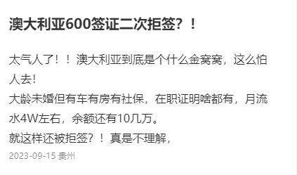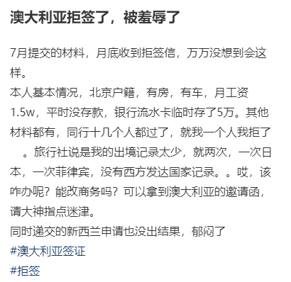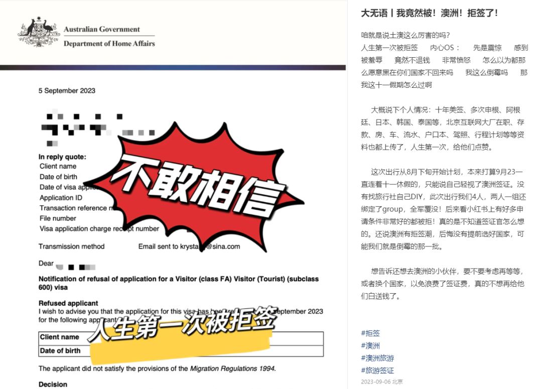 圖片來源:Daily Telegraph 但事實上,個人的旅游簽也是個大問題。 從去年以來,旅游簽拒簽率不斷升高,讓很多中國游客放棄了前往澳洲的念頭。 在華人的社交媒體軟件上,就充斥著不少對澳洲旅游簽申請的吐槽,基本上都與被澳洲拒簽有關(guān)。 現(xiàn)在,澳洲的拒簽率極高,想要獲得簽證異常困難。 圖片來源:小紅書@krystalbj 比如說這位博主,她人生之中第一次被拒簽就是澳洲給予的。 看看這位博主的資質(zhì)吧:十年美簽、多次申根、阿根廷、日本、韓國、泰國等,北京互聯(lián)網(wǎng)大廠在職、存款、房、車、流水、戶口本、駕照、行程計劃等等資料全都有,也完整提交了。 本以為假期可以在澳洲旅行,結(jié)果簽證申請直接被拒。 被澳洲拒簽的可不只是這一個例子,還有博主曬出了自己的情況。 圖片來源:小紅書 北京戶籍,有房有車,月薪穩(wěn)定,也提交了銀行流水,結(jié)果被拒簽了... 還有人已經(jīng)是第二次被澳洲拒簽: 圖片來源:小紅書 據(jù)中介透露,現(xiàn)在澳洲的旅游簽基本批不下來,根本沒人敢接。由此可見旅游簽的拒簽率有多高。 所以也不能完全說中國游客對澳洲失去興趣,畢竟要來澳洲的前提是先拿到旅游簽證… 不然即便是中國游客想來,也來不了。 圖片來源:9 News 此前將中國游客視為最大國際預(yù)訂來源的運營商表示,現(xiàn)在中國游客排在第四位,而美國、英國和新西蘭占據(jù)了前三。 維州動物園旅游經(jīng)理Stephen Peppard表示,2月份恰逢農(nóng)歷新年,中國游客數(shù)量有所增加,但是仍舊只有疫情前40%的水平,復(fù)蘇的速度比預(yù)期要慢。 澳大利亞旅游局在市場推廣上做了很多工作,試圖吸引游客,我們希望我們在墨爾本動物園的龍項目,以極度瀕危的維州草原無耳龍為特色,能夠成為今年龍年的另一個亮點。 游樂體驗公司Big Red Group預(yù)測,中國進(jìn)口旅游市場還需要一年時間才能恢復(fù)到疫情前的水平,這讓運營商有時間重建和重新培訓(xùn)員工隊伍。 這家公司的首席執(zhí)行官David Anderson表示,同比預(yù)訂量出現(xiàn)積極跡象,澳大利亞內(nèi)陸奇觀和孤松考拉保護(hù)區(qū)等景點的預(yù)訂量分別同比增長2844%和131%。 在所有進(jìn)口旅游市場中,中國和東方市場喜歡走出去做事,我們發(fā)現(xiàn)中國入境游客在活動和景點方面的花費比其他市場更多。 因此,我們希望看到中國入境游客回歸,因為從很多方面來說,他們是所有其他入境市場體驗行業(yè)中最有價值的游客類型。