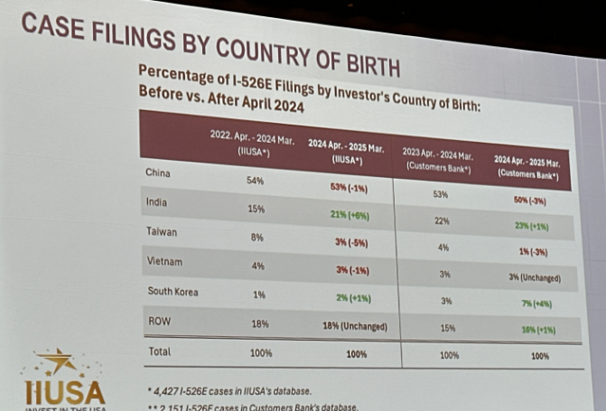 峰會披露的遞案數(shù)據(jù)顯示,2022年4月至2025年4月期間,中國大陸申請人以53%-54%的占比穩(wěn)居EB-5申請量榜首,延續(xù)了多年來的主導(dǎo)地位。