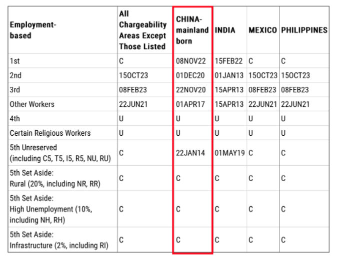 EB-5預(yù)留簽證類別:C代表無排期;