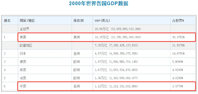 彼時(shí),中國(guó)GDP在世界排第六,僅1.21萬(wàn)億美元,占世界3.58%。