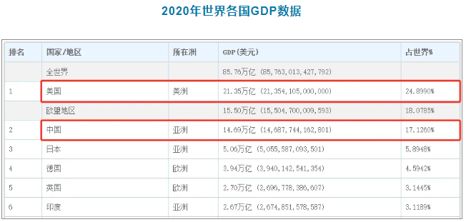 時(shí)間來(lái)到2020年,美國(guó)的GDP總值來(lái)到21.35萬(wàn)億美元,對(duì)比2000年翻了整整一倍!
