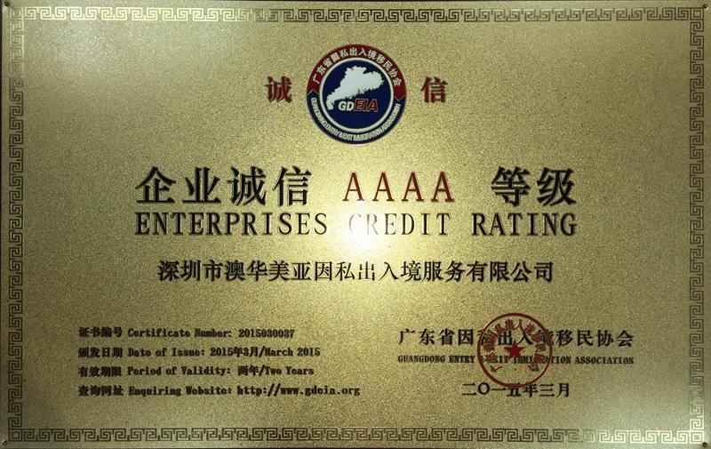 深圳市樹云教育發(fā)展有限公司榮獲廣東省因私出入境移民協(xié)會頒發(fā)企業(yè)誠信AAAA等級