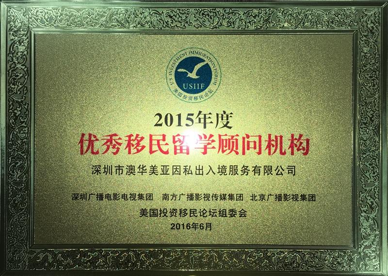 深圳市樹云教育發(fā)展有限公司榮獲深圳廣播電視集團、南方廣播影視傳媒集團、北京廣播影視集團、美國投資移民論壇組委會頒發(fā)的2015年度優(yōu)秀移民留學(xué)顧問機構(gòu)