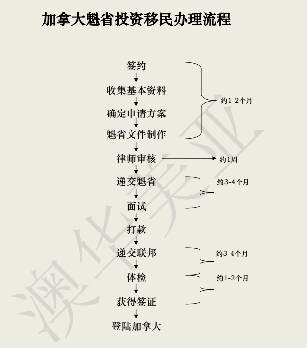 備注:以上流程是根據(jù)加拿大魁北克投資移民目前的申請程序制定,在申請過程中,如申請流程或者時間發(fā)生變化,甲方僅負有通知的義務。