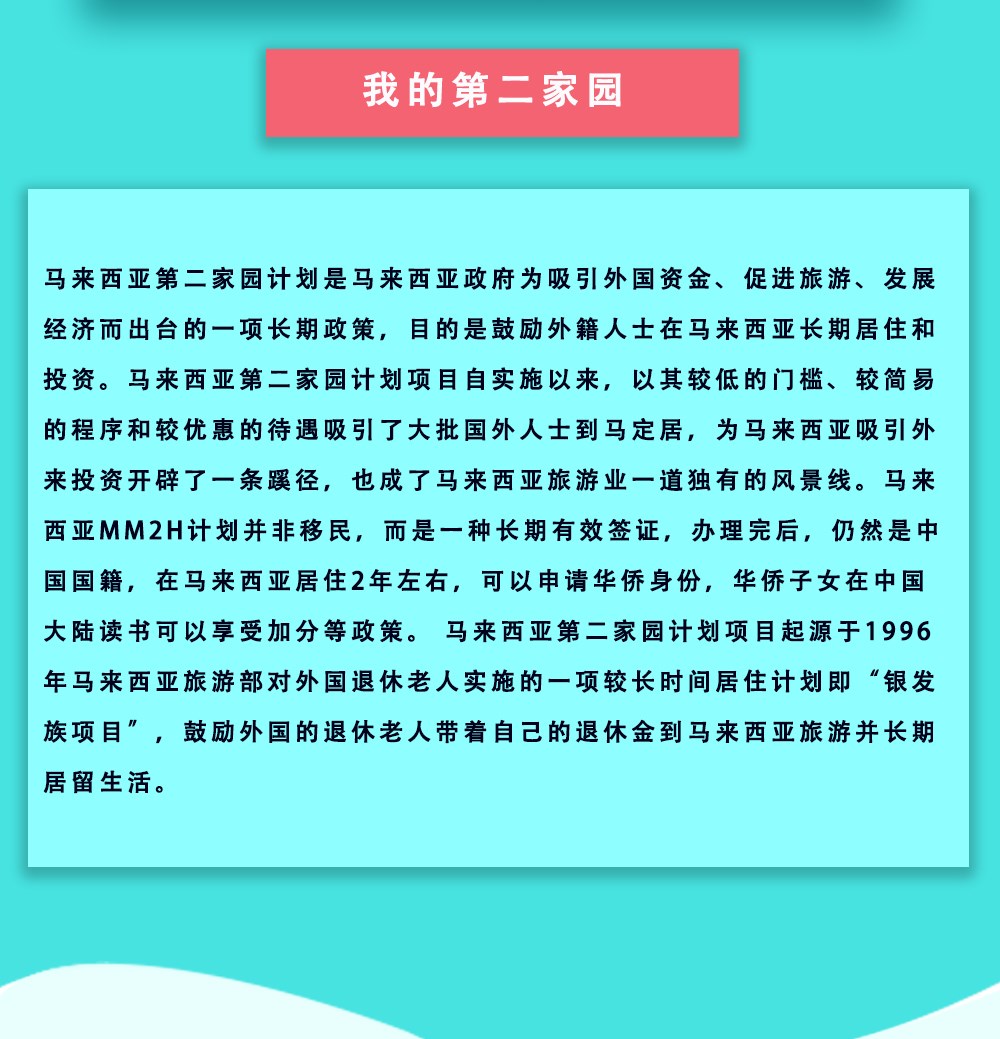 馬來(lái)西亞第二家園計(jì)劃是馬來(lái)西亞政府為吸引外國(guó)資金、促進(jìn)旅游、發(fā)展經(jīng)濟(jì)而出臺(tái)的一項(xiàng)長(zhǎng)期政策,目的是鼓勵(lì)外籍人士在馬來(lái)西亞長(zhǎng)期居住和投資。馬來(lái)西亞第二家園計(jì)劃項(xiàng)目自實(shí)施以來(lái),以其較低的門檻、較簡(jiǎn)易的程序和較優(yōu)惠的待遇吸引了大批國(guó)外人士到馬定居,為馬來(lái)西亞吸引外來(lái)投資開(kāi)辟了一條蹊徑,也成了馬來(lái)西亞旅游業(yè)一道獨(dú)有的風(fēng)景線。馬來(lái)西亞MM2H計(jì)劃并非移民,而是一種長(zhǎng)期有效簽證,辦理完后,仍然是中國(guó)國(guó)籍,在馬來(lái)西亞居住2年左右,可以申請(qǐng)華僑身份,華僑子女在中國(guó)大陸讀書(shū)可以享受加分等政策。